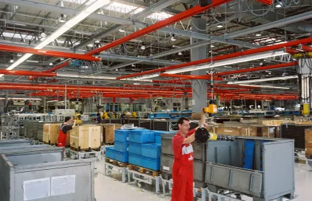 DEUTZ had components from our modular KBK crane construction kit installed beneath the ceiling to serve the entire bay from the order-picking zones to the shipping area. This solution requires no supporting pillars and makes modifications extremely uncomplicated. For example, workstation layouts can be modified or new equipment can be added to the line in just one weekend. Thanks to the defined system grid dimension, cranes from the modular crane construction kit can be quickly and easily transferred to another area.