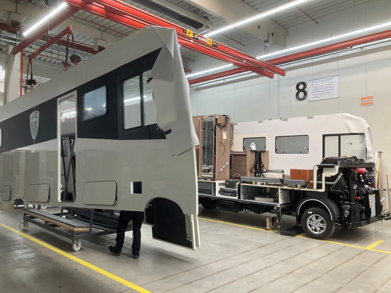 The assembly line starts with a chassis that has been prepared by a vehicle man-ufacturer as a partner company, e.g. with reinforcements in the chassis and mounting points for the body. Then the ‘bare’ chassis moves through a production line with 25 stations and ultimately emerges as a fully equipped, ready-to-drive luxury motorhome. One detail illustrates just how complex the assembly process is: between eight and 25 kilometres of cables are laid in a single motorhome.