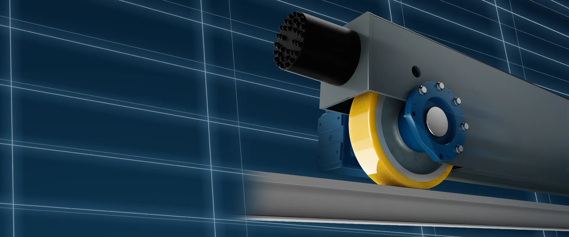 A new material composition and optimized geometry make it possible: The extremely robust cast iron core is en cased in a polyurethane (PUR) bandage, which not only provides more performance in terms of speed. At the same time, the new wheel enables higher payloads to be accommodated compared to the previous models. Extensive test series in our test field have substantiated these results. Guided on aluminium rails, the wheels with PUR drum are characterised by very quiet and gentle running.