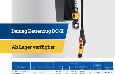 Demag oferuje trzy wielkości konstrukcyjne (DC-II 1/2, DC-II 5 i DC-II 10) o udźwigu od 125 do 2000 kg jako prefabrykowane wciągniki łańcuchowe. Ich dodatkową zaletą jest szybka dostępność i perfekcyjne dopasowanie sprawdzonych komponentów.